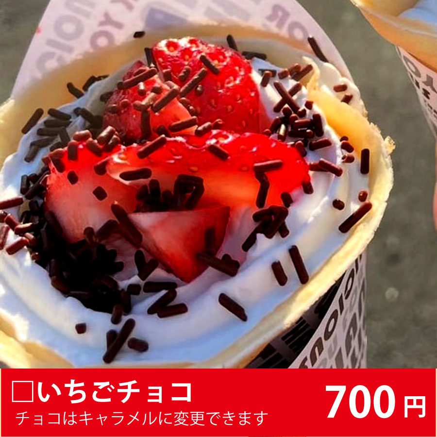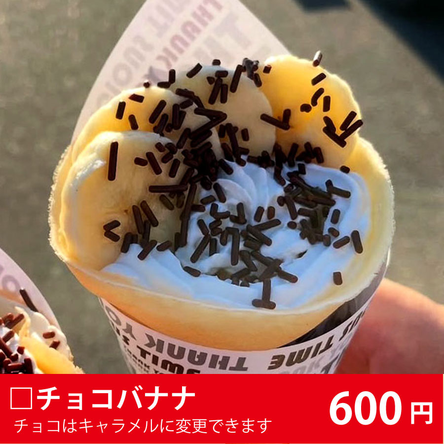 もちもちしたクレープ生地とバナナ、チョコレート、そしてホイップクリームの組み合わせです。食感のアクセントとして、パリパリとした焼きチョコが楽しめます。
